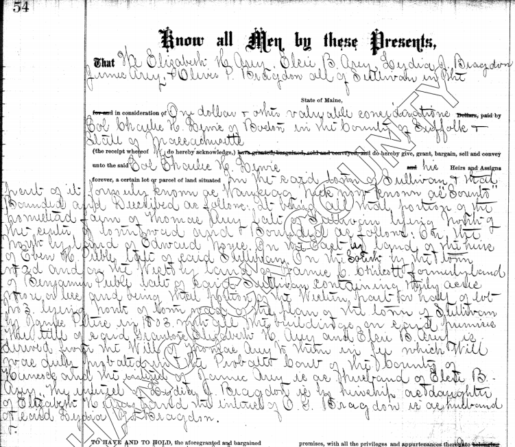 Based on land records I have reviewed, his statement about the number of sales and buildings under construction may have been somewhat exaggerated. But his interview no doubt had the desired effect to boost Lewis' goal of creating interest in the company's stock price. While Lewis may not have sold anywhere near his estimate of 100 lots he had made a dozen or more sales since the end of the Summer. And while it is doubtful that 40 cottages would be built by the Summer, a handful of cottages were indeed under construction. Below is a hand-written ledger, also from Norwich University archives, of some lots sold to Dr. William Goss of Boston in the Fall of 1886. Goss would soon begin construction on his home which still stands today overlooking the harbor. This note documents the exchange of plots Goss made for another better-situated lot.